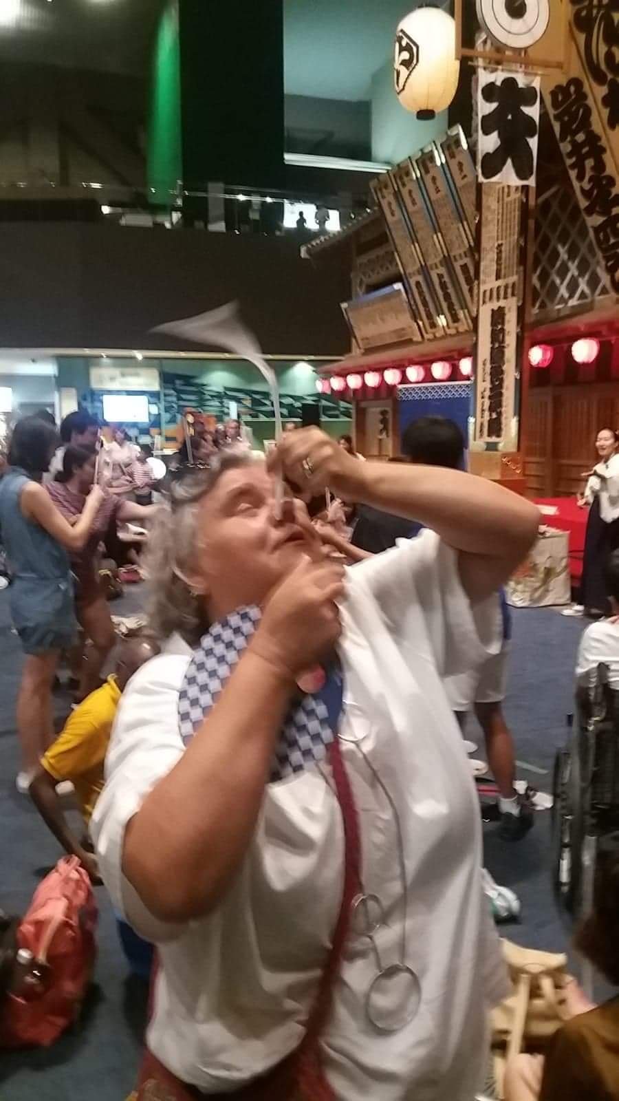 Kabuki is a very old form or dance-drama. In 2005, the Kabuki theatre was proclaimed by UNESCO as an intangible heritage possessing outstanding universal value. Yesterday Pete and I had watched something on TV about it, the programme looked like their equivalent of This Morning. We gleaned that the actors kept the tradition in the family, Hayshimi confirmed this. Watching it, it looks decidedly odd, but then so does a lot from the UK if you dissect it. Anyway they had the same tradition as Shakespeare’s time where only boys could play women but Hayshimi says it’s changed now. There were games being played in one area, I think they were linked to geisha. One was balancing a piece of paper on top of our noses. Pete was much better but I think it’s not about skill his nose is bigger. I wasn’t so good!
