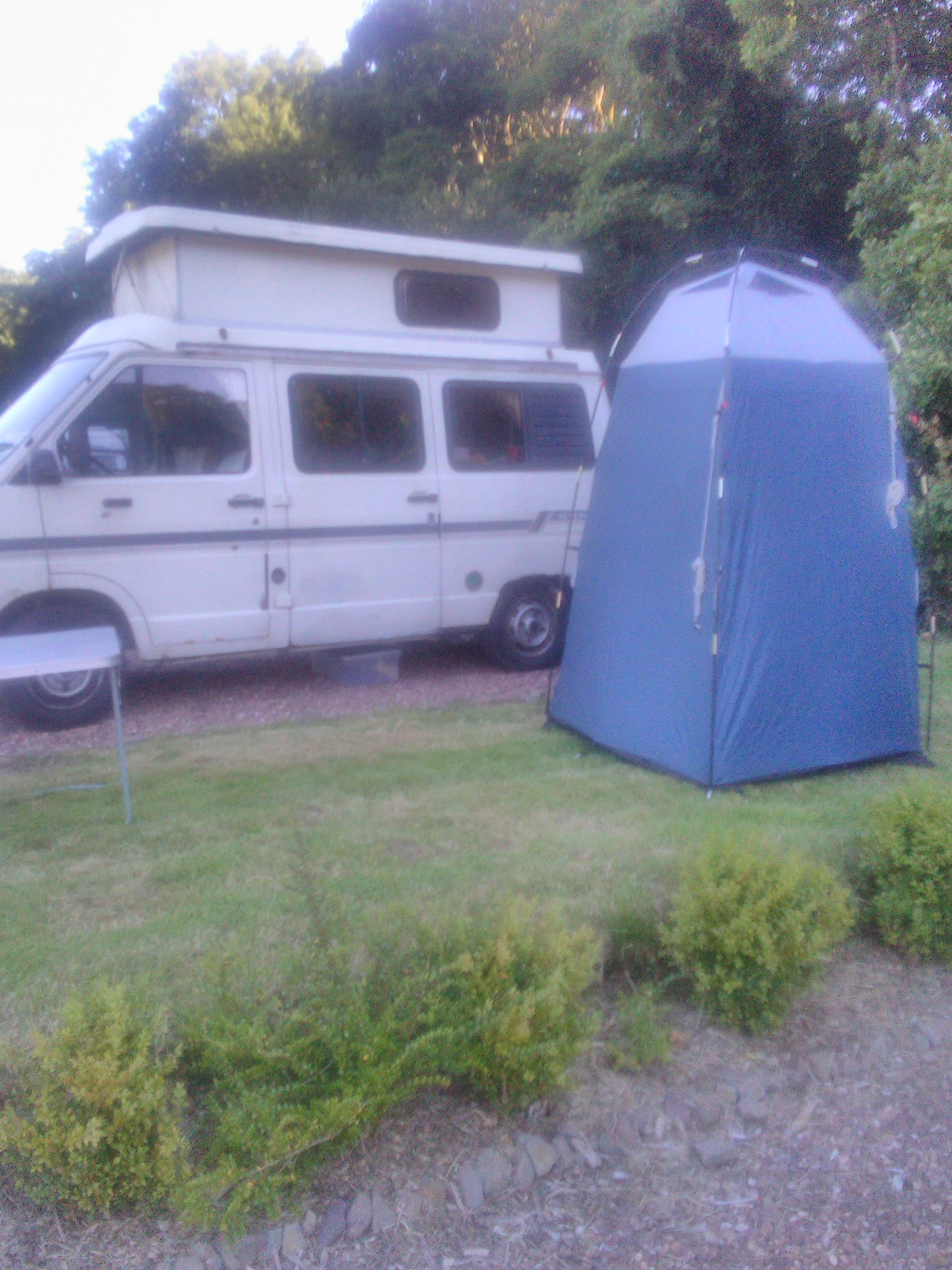 Despite the site being pretty empty we were given an awful plot so in time honoured fashion we asked if we could move. When we got the van 7 years ago they threw in a toilet tent too. As the van is 31 years old I had never looked at the toilet tent, we have never used it before and I had always been under the impression that it would also be an antiquity. I hadn’t realised what a bobby dazzler it is, it is enormous and it has a shelf inside. Such luxury…..