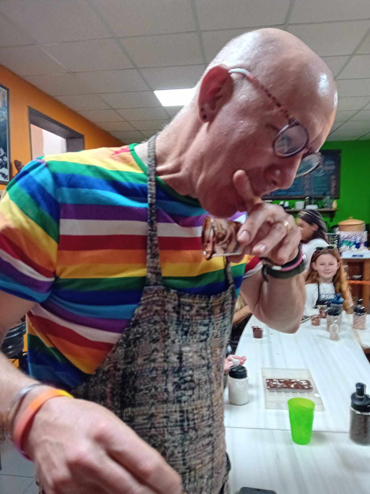 Pete being a real trooper and fighting through the pain of a blister. We had to grind the roasted seeds into a paste. She made it into a competition, the first person to succeed got a chocolate. We didn’t win!
