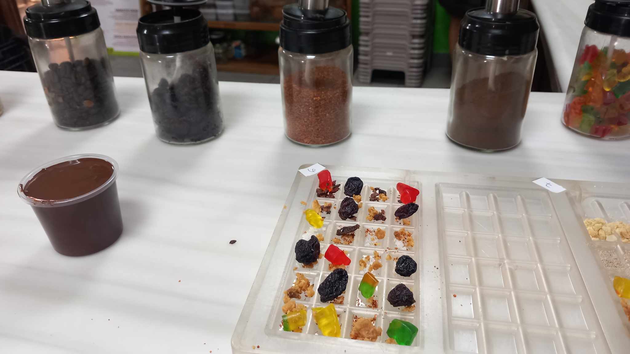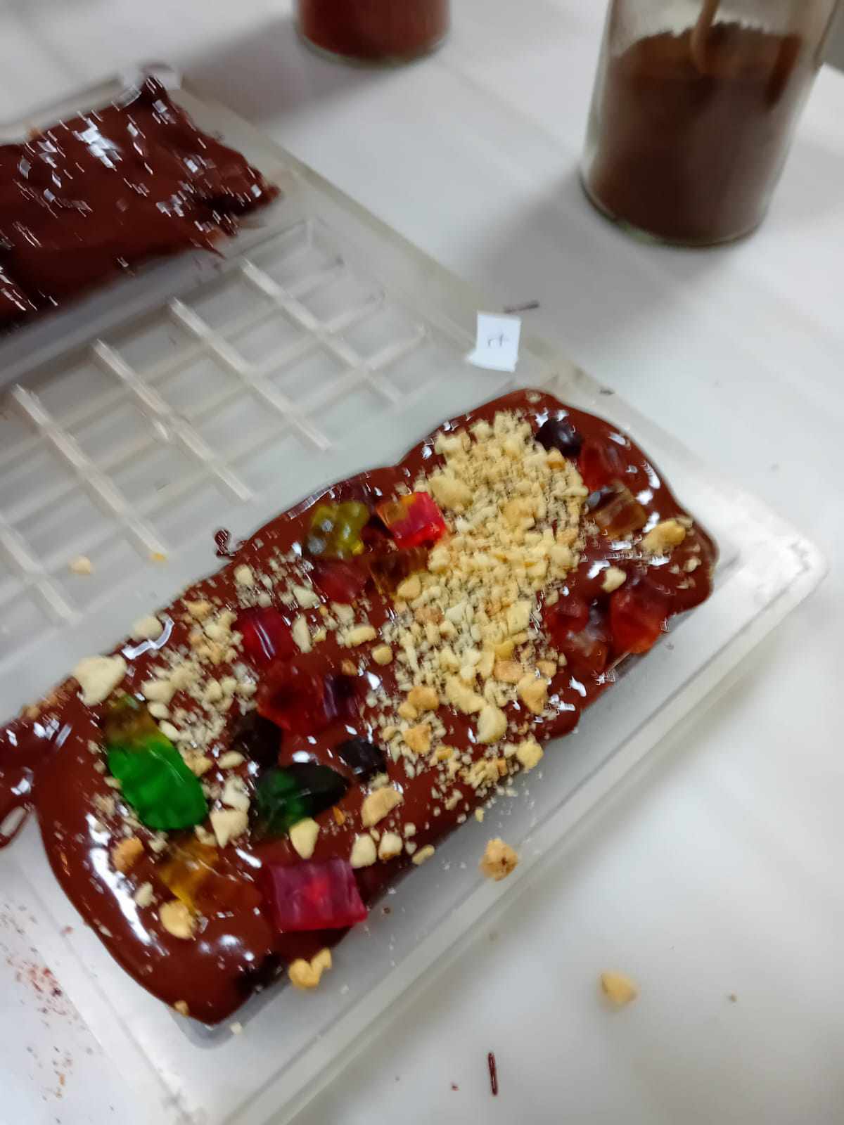 After the first preamble about chocolate we were given the task of producing our own chocolate bar. A range of toppings were distributed. I went completely over the top, no less is more with my design. On one side I carefully filled each square with different flavours, ground cardamom, cocoa nibs, chilli to name a few. Once the base was covered in a thick layer of chocolate I then proceeded to top with haribos, nuts and pretty much anything I could get my hands on!