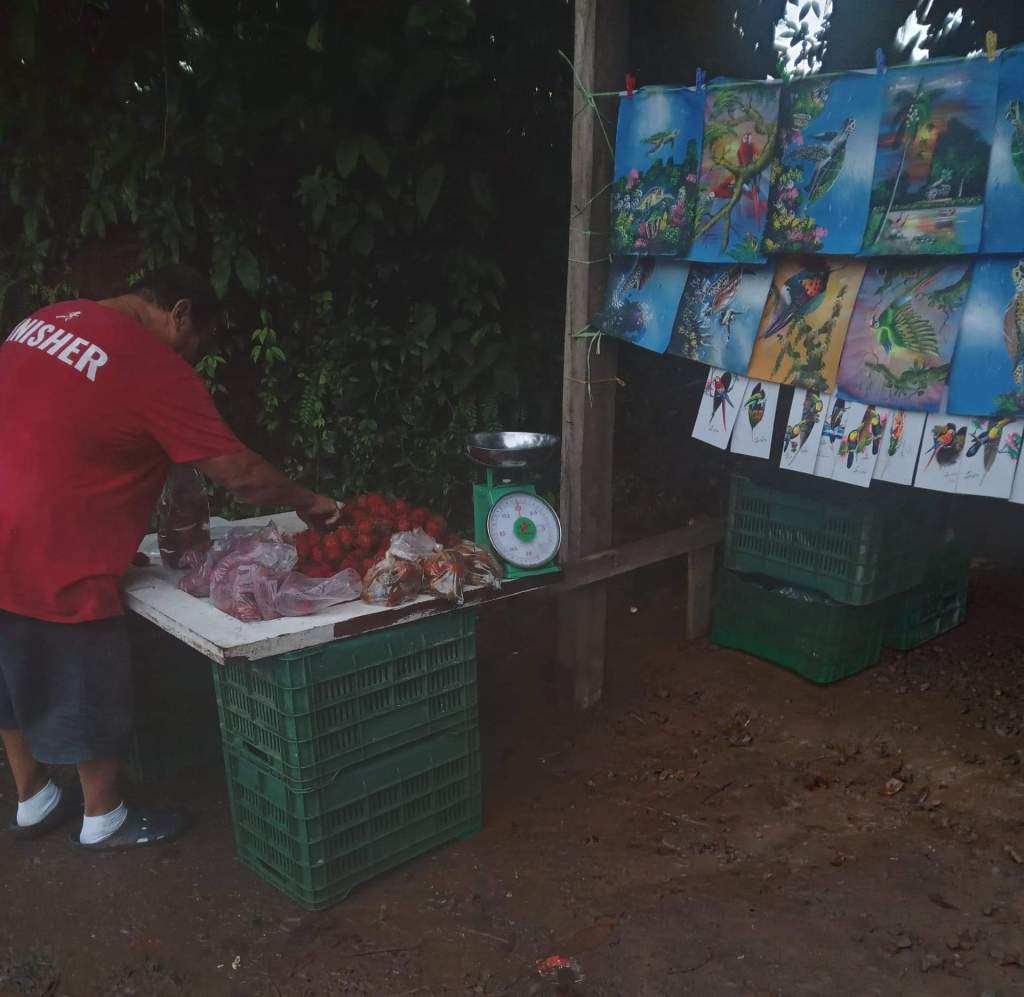 Lovely ducks waddled round the picnic tables. The prices inside the cafe/souvenir shop were eye wateringly expensive in Costa Rica terms. So we left the other passengers and cannily went to a nearby shop, where Pete wanted to do a photo shoot.